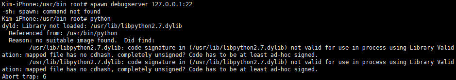 spawn으로 debugserver를 열어주려고 했으나 spawn 명령어 사용이 되지않았다.