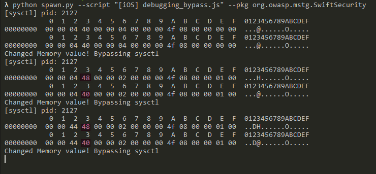 디버깅 탐지시 사용되는 sysctl의 값이 변조되어 탐지를 우회하는 것을 확인할 수 있다.